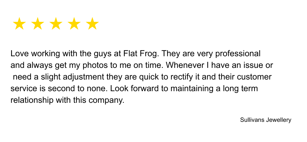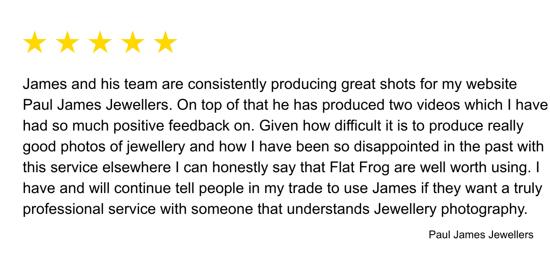 At Flat Frog Photography, we use advanced cinema cameras to produce stunning high-resolution jewellery videos and product photography. Each piece is filmed in exquisite detail, revealing every sparkle and surface finish.